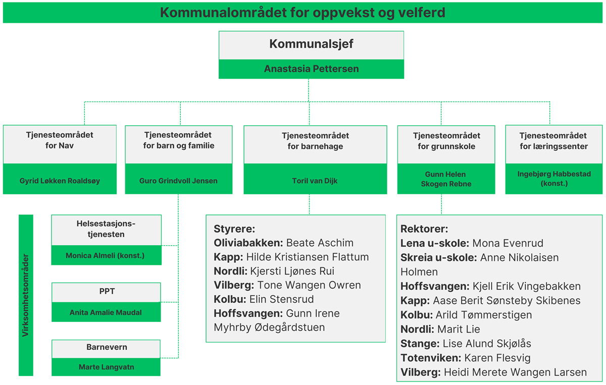 Kommunalområdet for oppvekst og velferdKommunalområdet ledes av kommunalsjef Anastasia Pettersen.Kommunalsjefen har ansvar for følgende samfunnstemaer:barn og ungeintegreringsosiale tjenester Publisert 03.04.2018 12.55 Sist endret 13.03.2026 09.59