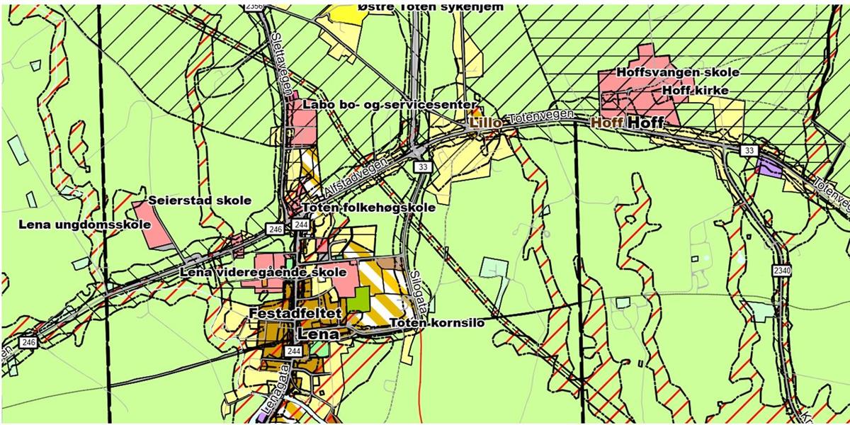 Du kan se gjeldende kommunedelplan for Lena og kommuneplanens arealdel i kommunens kartløsning.